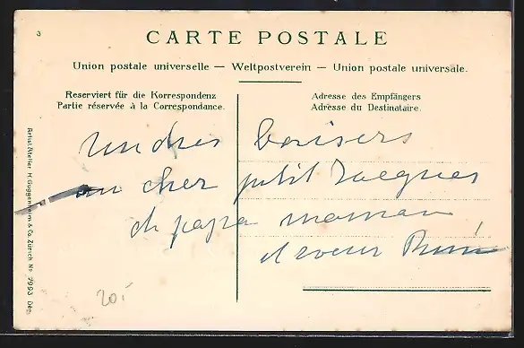 Personenbezogene Daten auf der Rückseite der Karte wurden durch blauen Textmarker unkenntlich gemacht. Die blauen Stellen sind auf die Vorderseite durchgeweicht und wirken sich negativ auf das Postkartenfoto aus