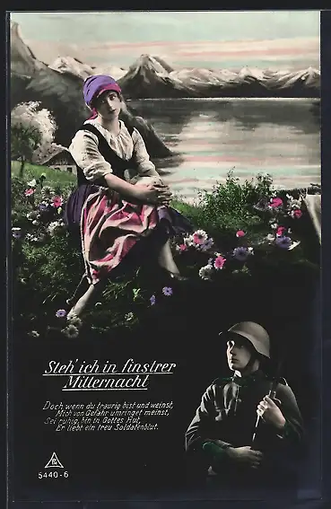 AK Schweizer Soldat in Uniform mit Waffe und Frau auf Blumenwiese