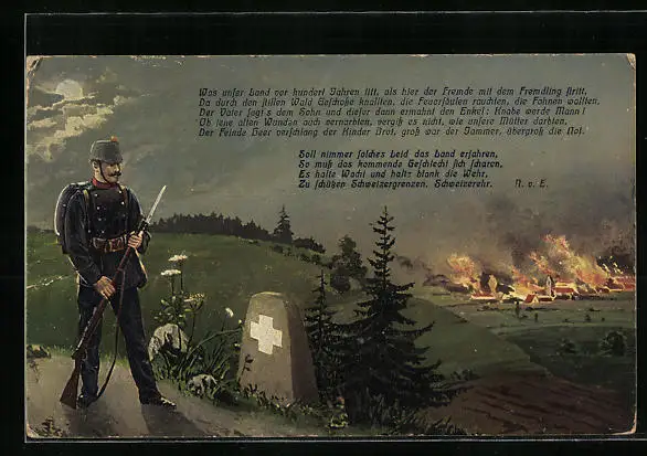 AK Schweizer Soldat mit Gewehr nachts vor brennender Stadt