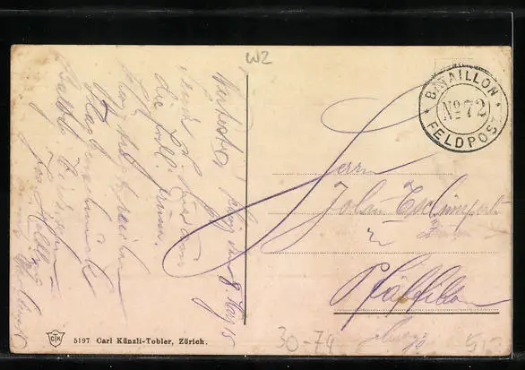Personenbezogene Daten auf der Rückseite der Karte wurden durch blauen Textmarker unkenntlich gemacht. Die blauen Stellen sind auf die Vorderseite durchgeweicht und wirken sich negativ auf das Postkartenfoto aus