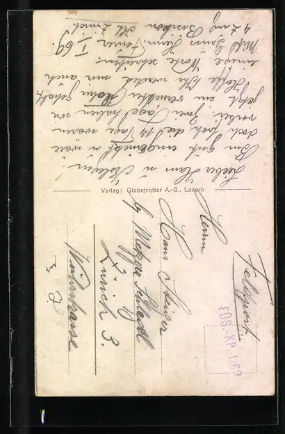 Personenbezogene Daten auf der Rückseite der Karte wurden durch blauen Textmarker unkenntlich gemacht. Die blauen Stellen sind auf die Vorderseite durchgeweicht und wirken sich negativ auf das Postkartenfoto aus