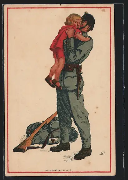 AK Schweizer Soldat schliesst seine kleine Tochter in den Arm, Gewehr