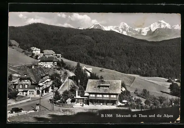 AK Schwendi ob Thun, Ortsansicht mit den Alpen