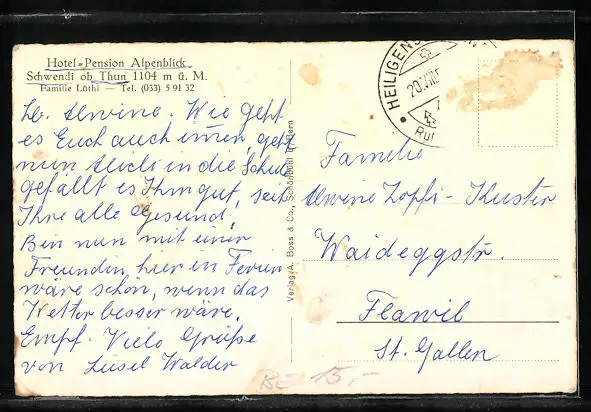 Personenbezogene Daten auf der Rückseite der Karte wurden durch blauen Textmarker unkenntlich gemacht. Die blauen Stellen sind auf die Vorderseite durchgeweicht und wirken sich negativ auf das Postkartenfoto aus
