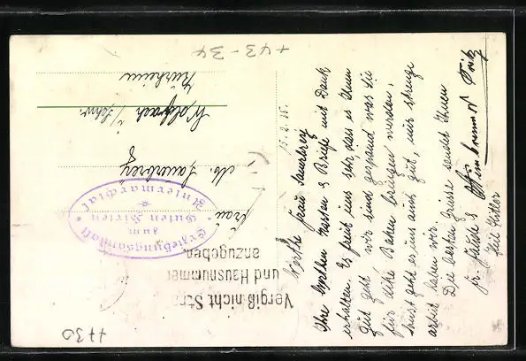 Personenbezogene Daten auf der Rückseite der Karte wurden durch blauen Textmarker unkenntlich gemacht. Die blauen Stellen sind auf die Vorderseite durchgeweicht und wirken sich negativ auf das Postkartenfoto aus