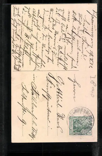Personenbezogene Daten auf der Rückseite der Karte wurden durch blauen Textmarker unkenntlich gemacht. Die blauen Stellen sind auf die Vorderseite durchgeweicht und wirken sich negativ auf das Postkartenfoto aus