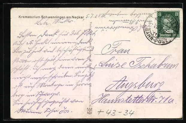 Personenbezogene Daten auf der Rückseite der Karte wurden durch blauen Textmarker unkenntlich gemacht. Die blauen Stellen sind auf die Vorderseite durchgeweicht und wirken sich negativ auf das Postkartenfoto aus