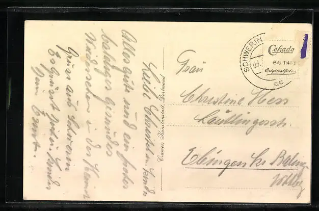 Personenbezogene Daten auf der Rückseite der Karte wurden durch blauen Textmarker unkenntlich gemacht. Die blauen Stellen sind auf die Vorderseite durchgeweicht und wirken sich negativ auf das Postkartenfoto aus
