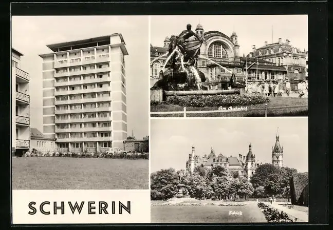 AK Schwerin, Hochhaus, Partie am Bahnhof, Schloss