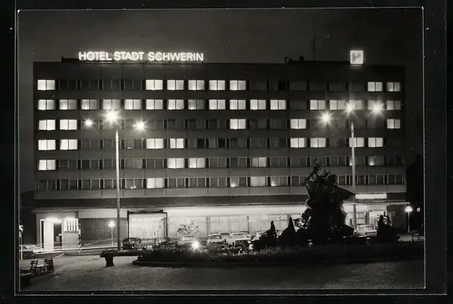 AK Schwerin, Hotel Stadt Schwerin bei Nacht
