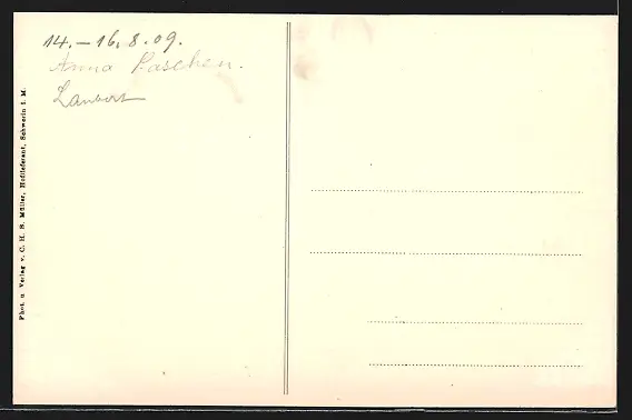 Personenbezogene Daten auf der Rückseite der Karte wurden durch blauen Textmarker unkenntlich gemacht. Die blauen Stellen sind auf die Vorderseite durchgeweicht und wirken sich negativ auf das Postkartenfoto aus