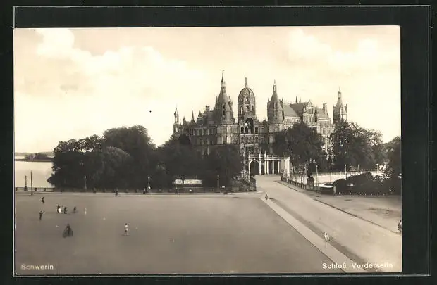 AK Schwerin, Vorderseite des Schlosses mit Besuchern