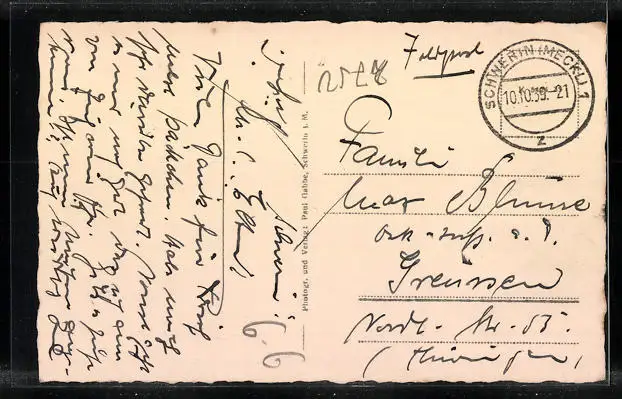 Personenbezogene Daten auf der Rückseite der Karte wurden durch blauen Textmarker unkenntlich gemacht. Die blauen Stellen sind auf die Vorderseite durchgeweicht und wirken sich negativ auf das Postkartenfoto aus
