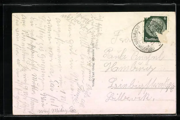 Personenbezogene Daten auf der Rückseite der Karte wurden durch blauen Textmarker unkenntlich gemacht. Die blauen Stellen sind auf die Vorderseite durchgeweicht und wirken sich negativ auf das Postkartenfoto aus