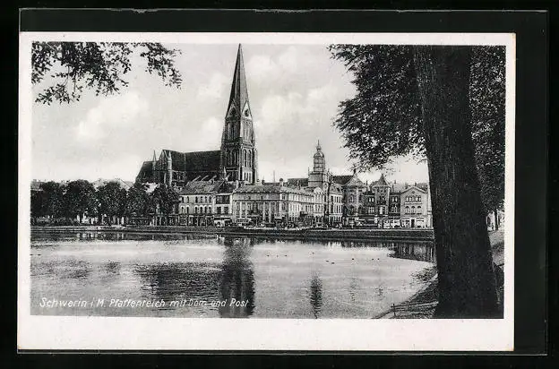 AK Schwerin i. M., Pfaffenteich mit Dom und Post