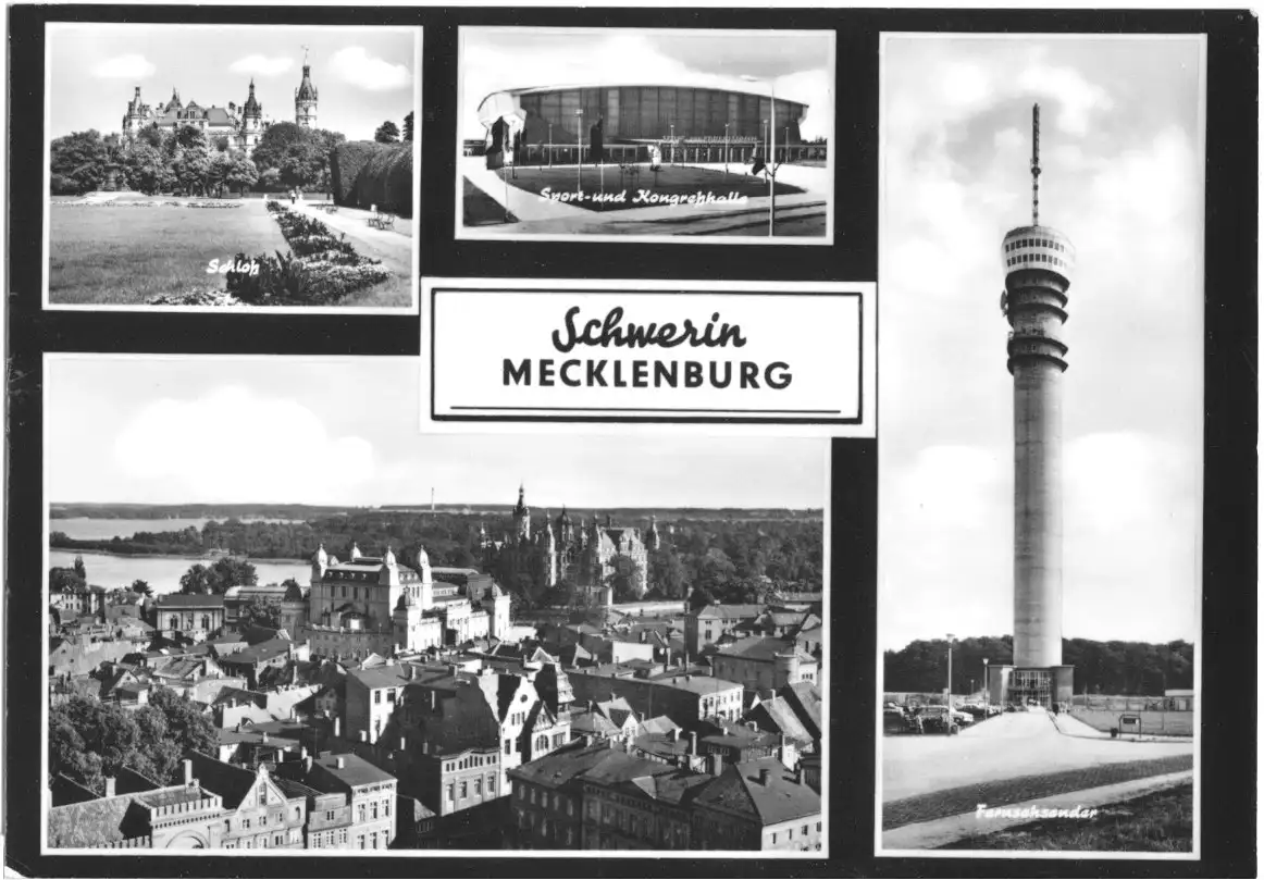 Ansichtskarte Schwerin vier Abb., gestaltet, u.a. Fernsehturm Erhaltung I ungelaufen Druckvermerk: 1965 Herstellungsland: DDR Verlag: Graphokopie H. Sander, Berlin - H245