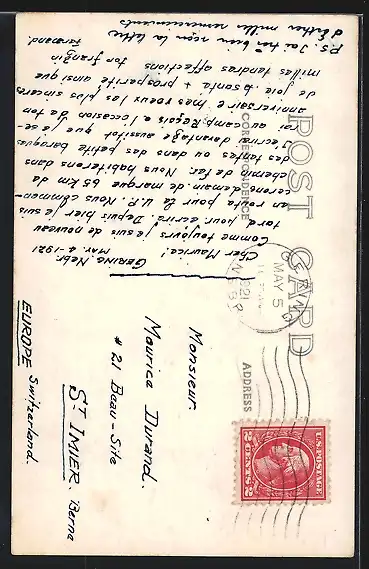 Personenbezogene Daten auf der Rückseite der Karte wurden durch blauen Textmarker unkenntlich gemacht. Die blauen Stellen sind auf die Vorderseite durchgeweicht und wirken sich negativ auf das Postkartenfoto aus