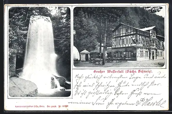 AK Sebnitz, Kirnitzschtal, am Grossen Wasserfalll, mit Restauration