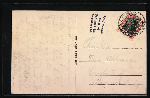 Personenbezogene Daten auf der Rückseite der Karte wurden durch blauen Textmarker unkenntlich gemacht. Die blauen Stellen sind auf die Vorderseite durchgeweicht und wirken sich negativ auf das Postkartenfoto aus
