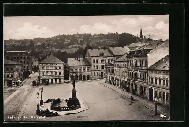 AK Sebnitz i. Sa., Marktplatz mit Geschäften und Denkmal