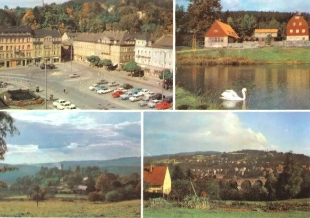 Ansichtskarte Sebnitz vier Abb. - August-Bebel-Platz, Betriebsferienlager "Rotes Ländchen", Pionierlager "Grete Walter", Blick über Viadukt zur Stadt Erhaltung I ungelaufen Druckvermerk: 1973 Herstellungsland: DDR Verlag: Brück & Sohn, Meissen - 30015