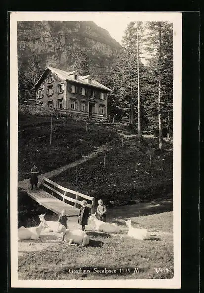 AK Seealpsee, Gasthaus mit Kindern und Ziegen