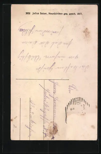 Personenbezogene Daten auf der Rückseite der Karte wurden durch blauen Textmarker unkenntlich gemacht. Die blauen Stellen sind auf die Vorderseite durchgeweicht und wirken sich negativ auf das Postkartenfoto aus