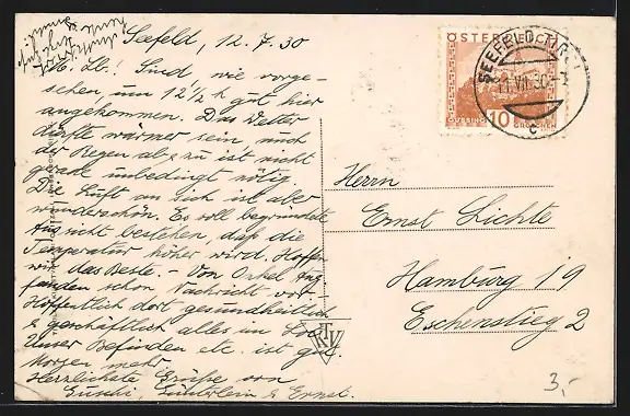 gelaufen 1930, Eckknick unten re., Einriss u. Bugspur re. oben, guter Zustand