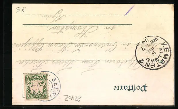 Personenbezogene Daten auf der Rückseite der Karte wurden durch blauen Textmarker unkenntlich gemacht. Die blauen Stellen sind auf die Vorderseite durchgeweicht und wirken sich negativ auf das Postkartenfoto aus