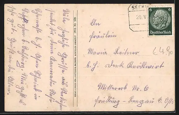 Personenbezogene Daten auf der Rückseite der Karte wurden durch blauen Textmarker unkenntlich gemacht. Die blauen Stellen sind auf die Vorderseite durchgeweicht und wirken sich negativ auf das Postkartenfoto aus