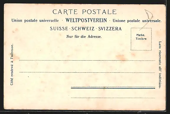Personenbezogene Daten auf der Rückseite der Karte wurden durch blauen Textmarker unkenntlich gemacht. Die blauen Stellen sind auf die Vorderseite durchgeweicht und wirken sich negativ auf das Postkartenfoto aus