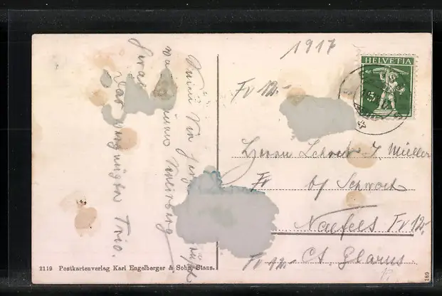 alte Ansichtskarte, gelaufen 1917, rückseitig Klebe- und Papierreste, Eckknicke li. unten u. re.