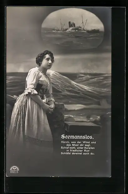 AK Seemannslos, trauernde Frau am Ufer, Kriegsschiff geht unter