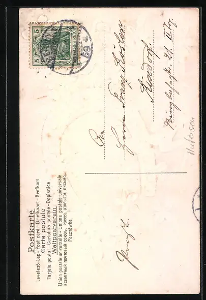 Personenbezogene Daten auf der Rückseite der Karte wurden durch blauen Textmarker unkenntlich gemacht. Die blauen Stellen sind auf die Vorderseite durchgeweicht und wirken sich negativ auf das Postkartenfoto aus