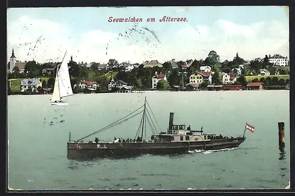 AK Seewalchen am Attersee, Dampfer und Segelboot auf dem See