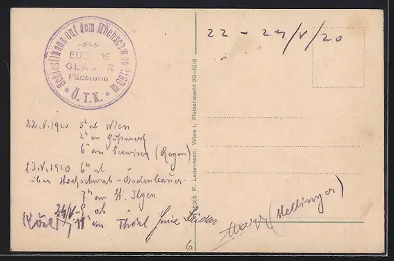 Personenbezogene Daten auf der Rückseite der Karte wurden durch blauen Textmarker unkenntlich gemacht. Die blauen Stellen sind auf die Vorderseite durchgeweicht und wirken sich negativ auf das Postkartenfoto aus