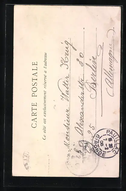 Personenbezogene Daten auf der Rückseite der Karte wurden durch blauen Textmarker unkenntlich gemacht. Die blauen Stellen sind auf die Vorderseite durchgeweicht und wirken sich negativ auf das Postkartenfoto aus