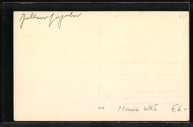 Personenbezogene Daten auf der Rückseite der Karte wurden durch blauen Textmarker unkenntlich gemacht. Die blauen Stellen sind auf die Vorderseite durchgeweicht und wirken sich negativ auf das Postkartenfoto aus