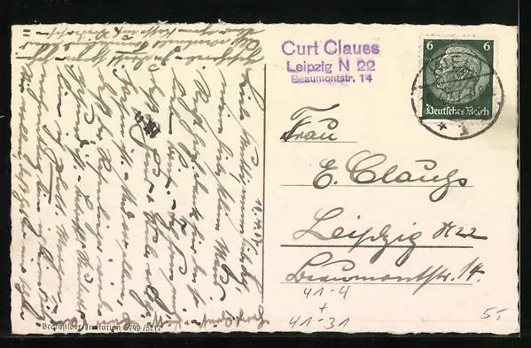 Personenbezogene Daten auf der Rückseite der Karte wurden durch blauen Textmarker unkenntlich gemacht. Die blauen Stellen sind auf die Vorderseite durchgeweicht und wirken sich negativ auf das Postkartenfoto aus