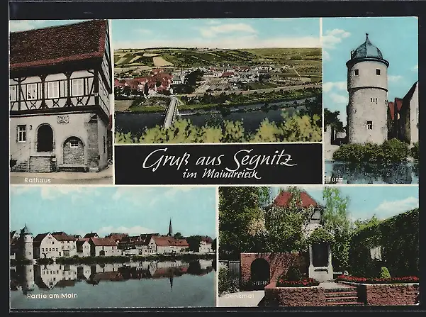 AK Segnitz, Rathaus, Panorama, Turm, Partie am Main