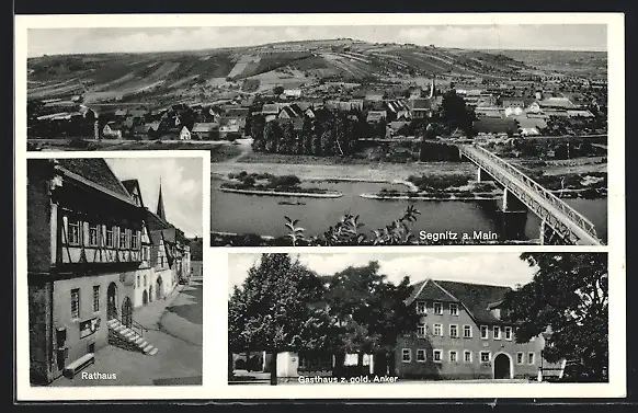 AK Segnitz a. Main, Gasthaus z. gold. Adler, Rathaus, Flusspartie mit Brücke