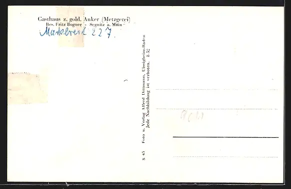 Personenbezogene Daten auf der Rückseite der Karte wurden durch blauen Textmarker unkenntlich gemacht. Die blauen Stellen sind auf die Vorderseite durchgeweicht und wirken sich negativ auf das Postkartenfoto aus