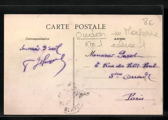 Personenbezogene Daten auf der Rückseite der Karte wurden durch blauen Textmarker unkenntlich gemacht. Die blauen Stellen sind auf die Vorderseite durchgeweicht und wirken sich negativ auf das Postkartenfoto aus