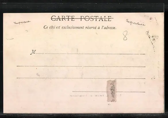 Personenbezogene Daten auf der Rückseite der Karte wurden durch blauen Textmarker unkenntlich gemacht. Die blauen Stellen sind auf die Vorderseite durchgeweicht und wirken sich negativ auf das Postkartenfoto aus