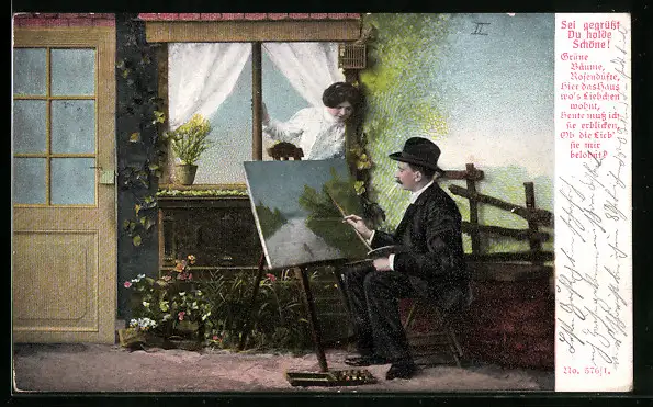 AK Sei gegrüsst Du holde Schöne!, Muse guckt dem Maler durchs Fenster