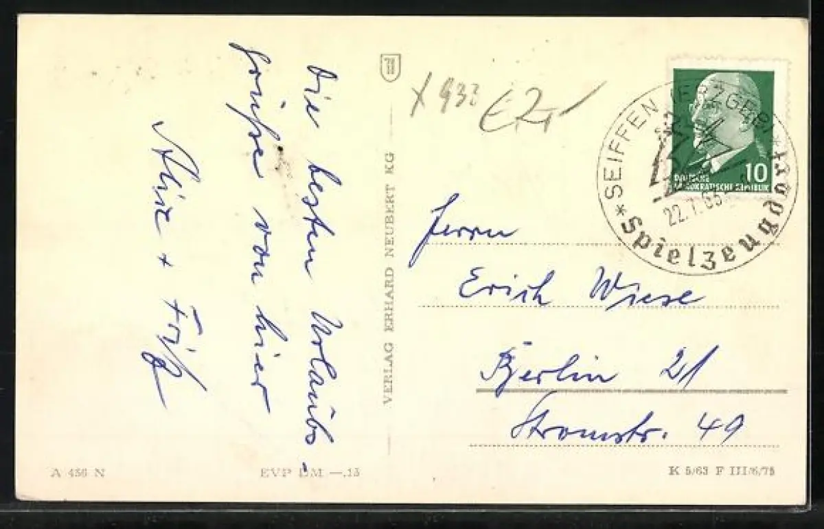 Personenbezogene Daten auf der Rückseite der Karte wurden durch blauen Textmarker unkenntlich gemacht. Die blauen Stellen sind auf die Vorderseite durchgeweicht und wirken sich negativ auf das Postkartenfoto aus