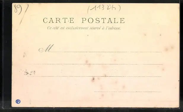 Personenbezogene Daten auf der Rückseite der Karte wurden durch blauen Textmarker unkenntlich gemacht. Die blauen Stellen sind auf die Vorderseite durchgeweicht und wirken sich negativ auf das Postkartenfoto aus