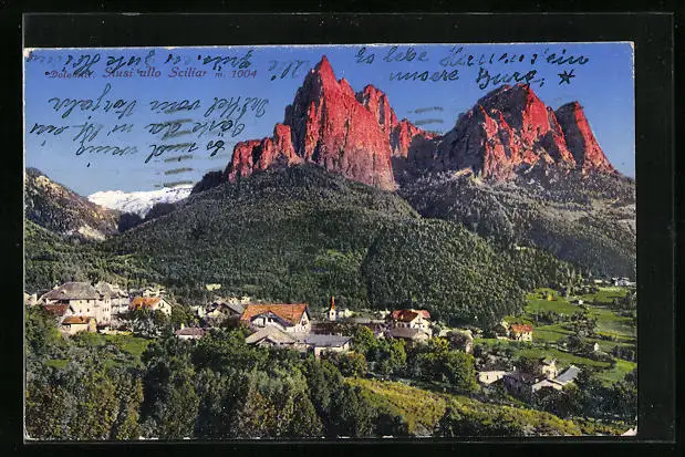 AK Seis am Schlern, Ortsansicht im Abendrot