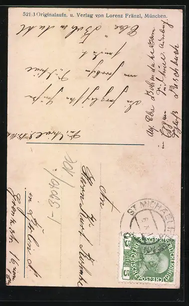 Personenbezogene Daten auf der Rückseite der Karte wurden durch blauen Textmarker unkenntlich gemacht. Die blauen Stellen sind auf die Vorderseite durchgeweicht und wirken sich negativ auf das Postkartenfoto aus