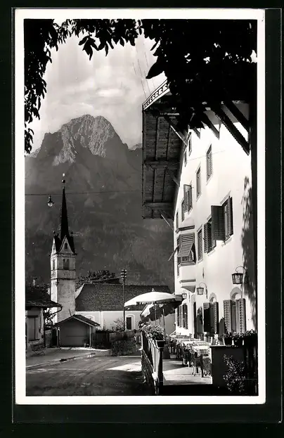 AK Seis am Schlern, Strassenpartie mit Kirche, Schlern